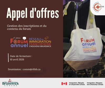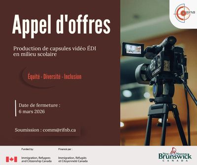 Le Réseau en immigration francophone du Nouveau-Brunswick (RIFNB) lance un appel d’offres pour la réalisation de capsules vidéo éducatives en milieu scolaire, mettant en valeur une initiative favorisant l’ouverture interculturelle, l’identité francophone et le vivre-ensemble.