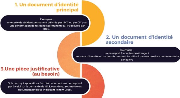 La liste des documents requis est exhaustive et varie selon que vous présentez votre demande en votre nom ou au nom de votre enfant. Voici un aperçu des documents requis pour une demande en votre nom. Pour plus d'informations, veuillez consulter le site Web de Service Canada (https://www.canada.ca/fr/emploi-developpement-social/services/numero-assurance-sociale.html).
